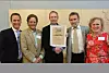 EV-PRISEN: NIBIOs divisjonsdirektør Bjørn Håvard Evjen (med diplomet) mottok årets skogpris på vegne av skogforskningen i Norge. Her sammen med representanter fra juryen: Fra venstre: Trygve Enger, Skogselskapet; Haaken Eric Mathiesen, Eidsvold Værk; Ivar Ekanger, LMD og Ellen Alfsen fra Norges skogeierforbund. Erling Bergsaker (Norskog) som også er medlem av komitéen var ikke til stede da bildet ble tatt. Foto: Roar Ree Kirkevold, Magasinet Skog.
