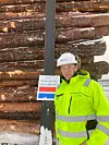NYTT OPPLEGG: Nils Anton Hæhre foran en lunne med furutømmer som er diametersortert i skogen.