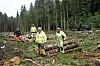 BLIR MYR: Skogbunnen her består av djup mold som snart skal blautes opp og gi vekstforhold for svartor og andre fuktighetselskende arter. Fra venstre Anders Kristian Asdal, lassbærerfører Uvis Klibikis, Lars Ragnvald Tveitan og hogstmaskinfører Svein Topstad.