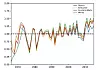 Situasjonen i de fem nordiske land er samlet sett en langsiktig (50–150 år) økning i tilvekst. Dette kan tilskrives endring i skogbehandlingen, økt nitrogennedfall og en sammenfallende økning i både temperatur og nedbør de seinere tiårene. For de siste årene så har det imidlertid vært visse unntak fra dette. Det har vært en nedgang i volumtilvekst hos furu i midtre deler av Finland, nedgang i tilvekst hos gran i midtre og søndre deler av Sverige, og en varierende tilvekst på gran i sørlige deler av Norge (Figur 2). I Norge har den langsiktige trenden med økt tilvekst kulminert, og tilveksten har siden 1995 blitt dominert av svingninger i tilvekst hos gran forårsaket av svingninger i nedbørmengde og tørkestress i Sør-Norge.