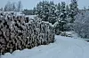 med stolper og sagtømmer ligger på veikant. Og