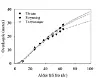 Overhøgde i høve til alder fram til siste revisjon hausten 2022, med triangel symbol, samt predikerte verdiar (tynne liner) frå spiring til hundre år.